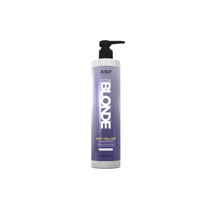 Restore the brightness of natural blonde, pre-lightened or white hair with this violet toning shampoo. System Blonde Anti-Yellow Shampoo gently removes impurities while colour-correcting pigments neutralise unwanted yellow tones & protect against brassiness. White or greying hair is enhanced with a hint of silver. Contains UV filter.
