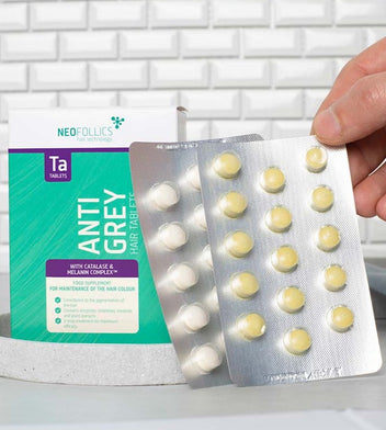 The Neofollics Anti Grey Tablets are the safe dietary supplement. It is developed to effectively combat the greying of hair and to maintain the natural hair colour. The tablets contain a unique two step treatment. Step 1 with Melanin Complex tablet and Step 2 with Catalase. The tablets also contain essential nutrients such as Copper, Zinc & Biotin that stimulate healthy hair growth. The tablets are suitable for every man and woman who suffer from premature greying hair from the earliest stages. In 90-180 days, it improves the overall pigmentation and appearance of the natural hair colour. One box of 60 Anti Grey tablets lasts up to 30 days.