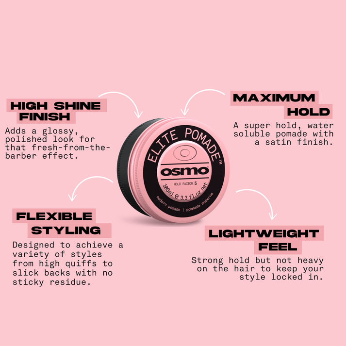 A super hold, water soluble pomade designed to achieve a variety of styles from high pomps to slick backs with no sticky residue.