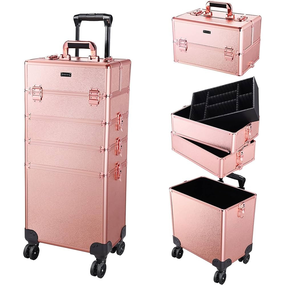 Rose Gold Rolling Makeup Case 4in1 Cosmetic Lockable Trolley Freelance Makeup Artist Travel Train Case Adjustable Handle Nail Organizer Box