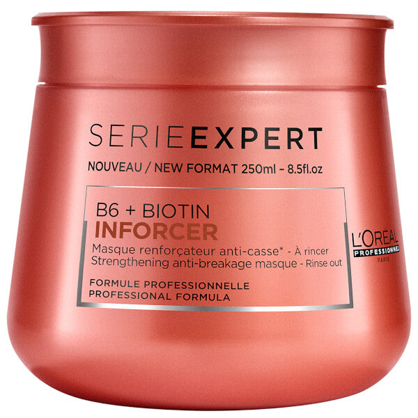 Inforcer Masque, for strengthening fragile hair. With a Biotin and B6 vitamin-enriched boost, this reinforcing masque is designed to target breakage and split ends, leaving hair soft and healthy. With continued use, Inforcer masque will help your hair become more resistant and stronger.