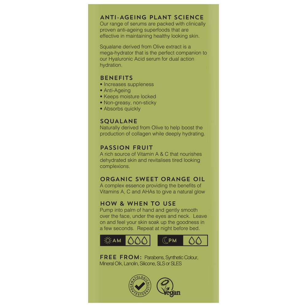 The +serumology SQUALANE Professional Facial Serum intensely hydrates, enriches and replenishes the skin, resulting in a youthful and energised complexion. Harnessing the power of Olive, Passionfruit, Organic Sweet Orange Oil and Organic Almond Oil, this fruit mix creates an anti-ageing formula that rejuvenates and soothes the skin.